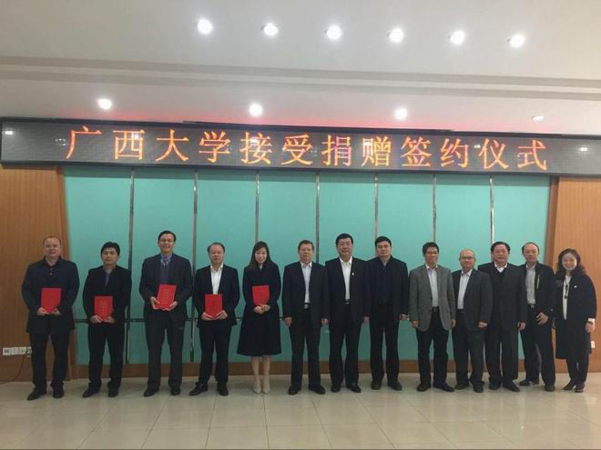 2017年12月9日,皇氏集團參加“廣西大學(xué)2017年校友返校日暨廣西大學(xué)90周年校慶倒計時(shí)1周年啟動(dòng)儀式”活動(dòng)并在捐贈儀式上捐贈100萬(wàn)元,為莘莘學(xué)子帶去一份暖冬的愛(ài)心支持,皇氏集團人力資源總監莫孫誠、行政部經(jīng)理石愛(ài)萍出席了儀式。
